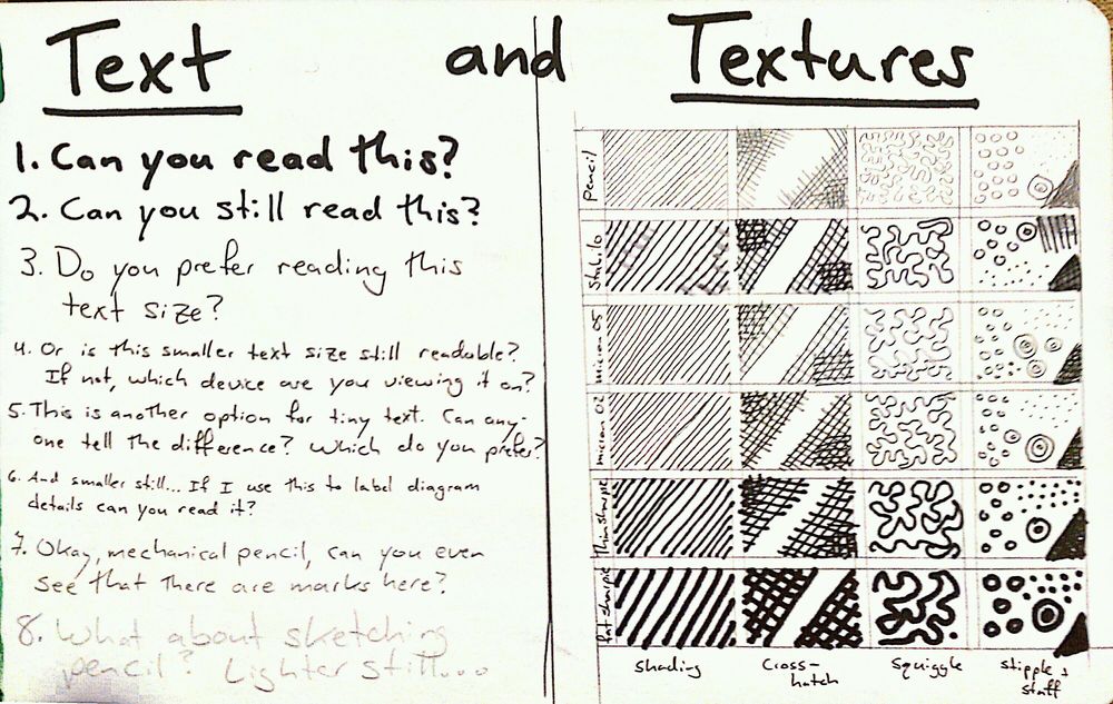 1. <div>Test patterns:</div> <div>For a person with old eyes this is a complicated question.</div> <div>As it comes up in my gmail, before I enlarge it, #3 is the smallest I can read comfortably without my eyeglasses.  If I squint I can read #4 and 5.  </div> <div>When I enlarge it, still no eyeglasses, both #4 and #5 are readable comfortably. I don't have a preference. Enlarged #6 – 8 are now readable without my eyeglasses.  The mechanical pencil, #7 looks a bit fuzzy and #8 the sketch pencil looks like ghost writing or invisible ink.  All of the test patterns are visable and clear, except #1, the pencil.  It's faded out.  The 3rd one down, it seems to say something 05 on the side, also has some faded areas.<br> Now with eyeglasses:  Gmail size I can read #6 with difficulty.<br>Enlarged with eyeglasses I can read everything.  #8 is still ghost like.   The test patterns are the same comments as above with and without the eyeglasses. Only now with the eyeglasses I can see some ghostly diagonal cross-hatching in the second one down, at right angle to the main pattern, that looks as though something was smudged or erased.  It seems to me that you might be experimenting in several ways with the appearance of various markings, not just clarity.</div> <div>Hope this is useful.</div> <div>Love,</div> <div>Mom</div> <div> </div>
