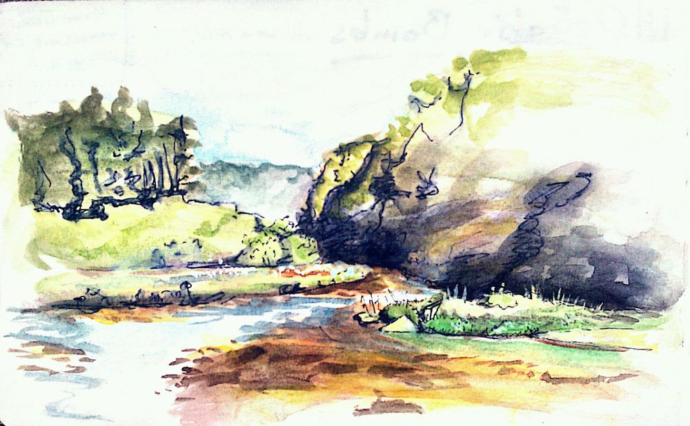 When I left my house this morning, I biked 30min up the coast, along rocky cliffs to Natural Bridges State Park. I parked my bike and sat down at a picnic table under a grove of eucalyptus trees. The air felt cool and the sky was thick and grey. I sat eating a bagel and drinking tea from a large, glass, antique canning jar. I checked my email on my phone and watched a man jog across an otherwise empty beach. Jenny joined me around 10am, and we explored the tide pools on the edge of the ocean cliffs. She was sharing stories with me about delicious food. We eventually settled into a comfortable spot to sit on the rocky cliffs. Instead of facing the ocean, Jenny was inspired to draw the river that fed into the bay at that point. So we sat with our backs to the ocean and drew the inlet. There was a mother duck and about six ducklings swimming around her in the little pool that formed before the creek fed into the ocean. As we sat and drew, the sun came out and the fog burned away. It got hot and people started gathering on the beach. Families with brightly colored umbrellas and blankets. A seal swam almost up to the beach, body surfing it's way in, and I could hear a little boy yelling excitedly at it, pointing to it to show his dad. When it was hot and we'd had enough sun, Jenny and I went back to her home together and she cooked me egg taco's for lunch.