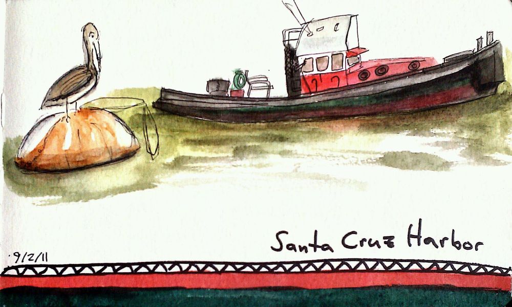 It's a cool foggy afternoon, and is starting to feel like autumn. I watched a seal swim along after a man paddle boarding while drawing this boat.
