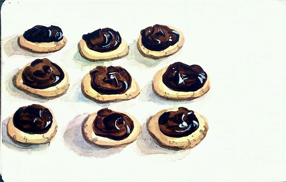 – anywhere from a few Tbs to about 1/4 pint of Heavy Whipping Cream Roll into walnut sized balls, flatten and bake at 350 for 15-20min until light golden brown. Let them cool. To make the ganache, whisk the cream into the chocolate a Tbs at a time over low heat or a double boiler, you want the texture to be thick and spreadable. Spoon on Tbs of ganache on top of each cookie. Let sit until solidified.