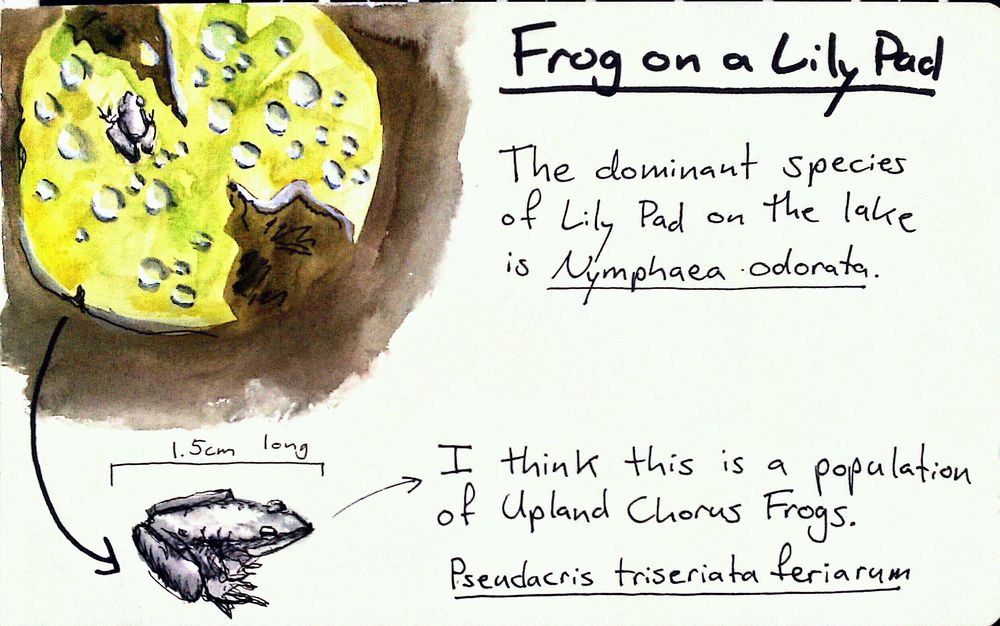 Mom and I went exploring at the National Wildlife Visitor Center. Alongside the bank of Lake Redington we found perched on a lily pad a tiny brown frog. In the water there was a sea of floating lily pads, a scattering of them had glassy droplets of water on the surface. As we sat and visited our new little frog friend, a spider larger than he was walked over and joined him.