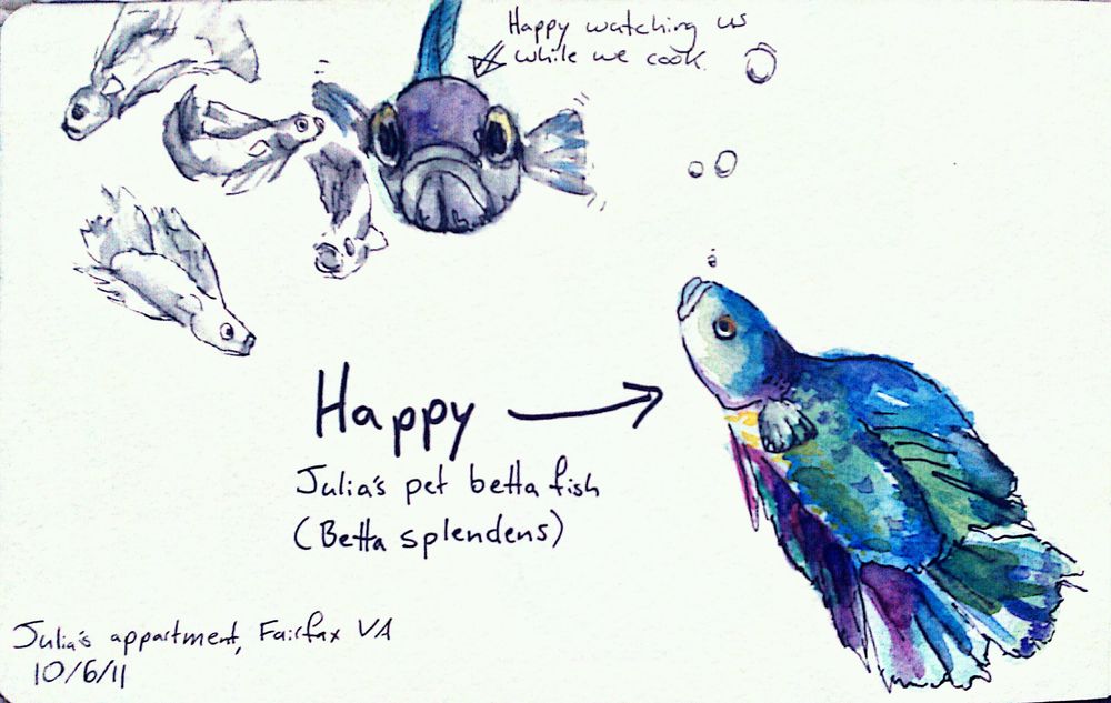 I'm visiting my friend Julia in Virginia. While we cooked raspberry pancakes and scrambled eggs for dinner, her fish, Happy, kept us company. He's very attentive and swims over and watches us while we cook. His little fish bowl with blue glass marbles sits on the counter of the breakfast bar, giving him an excellent vantage point for observing mammal feeding behavior.