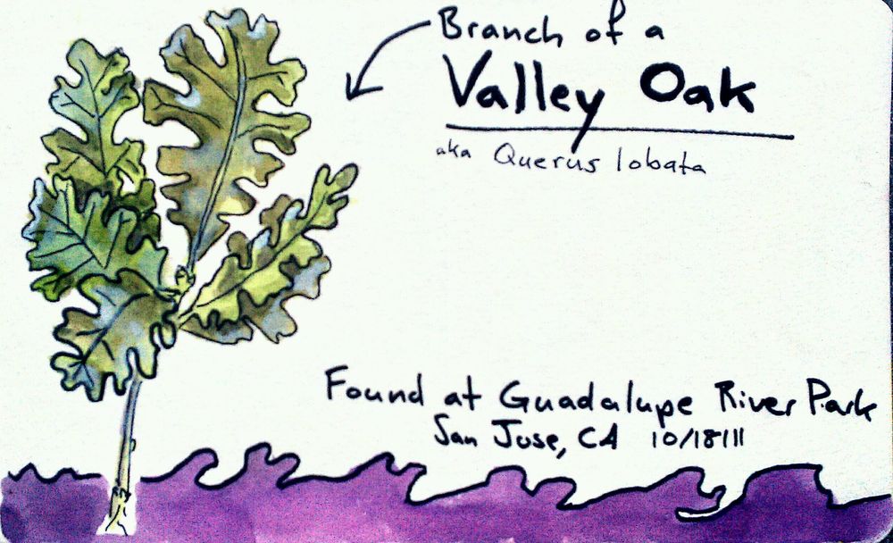 I'm on my way to Sacramento to visit Grandma, on my way through San Jose I met-up with Jen for a walk through the park. Not far from Diridon Station was Guadalupe River Park. Jen has been playing with a new copy of A Californian's Guide to the Trees Among Us by Matt Ritter, so as we walk we are looking at the trees more closely along the river. An umbel shaped flower gone to seed smells like anise, but the leaves look more like fennel. I scratch and sniff a tree that supposedly has bark that smells of peanut butter.Β