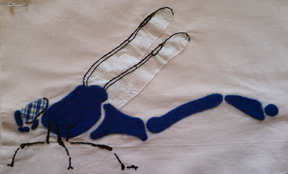 Of the insects on the crib bumpers, the dragonfly and the beetle are now complete. This one is the first done, our blue dragonfly. Kellie wool felted the body and I sewed on the wings, and eyes.