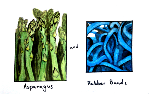 Springtime and asparagus are synonymous for me, the change of the seasons marked in rubber bands. At the end of winter my jar of rubber bands disappears, consumed by binding half used bags of sugar and picnic lunches. Just in time, the first asparagus appears at the farmers market. I don’t buy rubber bands, I buy asparagus. Thick blue rubber bands binding together each pound of asparagus, one rubber band at the top of the bunch the other at the bottom. Arthur loves asparagus so we easily go through six or seven pounds of it a week, which adds incrementally twelve to fourteen rubber bands back into the jar in my kitchen. It’s a few weeks into spring and I’m enjoying the proliferating springy mass of blue elastic.